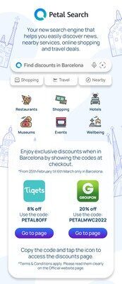 Партнеры Petal Search — Groupon и Tiqets — предлагают эксклюзивные скидки для гостей MWC в Барселоне: 20% при покупке купона на Groupon (по промокоду PETALMWC2022) и 8% — на Tiqets (по промокоду PETAL8OFF).