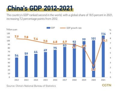 ВВП Китая вырос с 54 трлн юаней (7,5 трлн долл. США) в 2012 году до 114 трлн юаней (около 15,8 трлн долл. США) в 2021 году, а его доля в мировом ВВП достигла 18,5%, увеличившись на 7,2 процентного пункта. Страна остается второй по величине экономикой мира. В течение последнего десятилетия ее средний вклад в мировой экономический рост превышал 30%, что было лучшим показателем в мире.